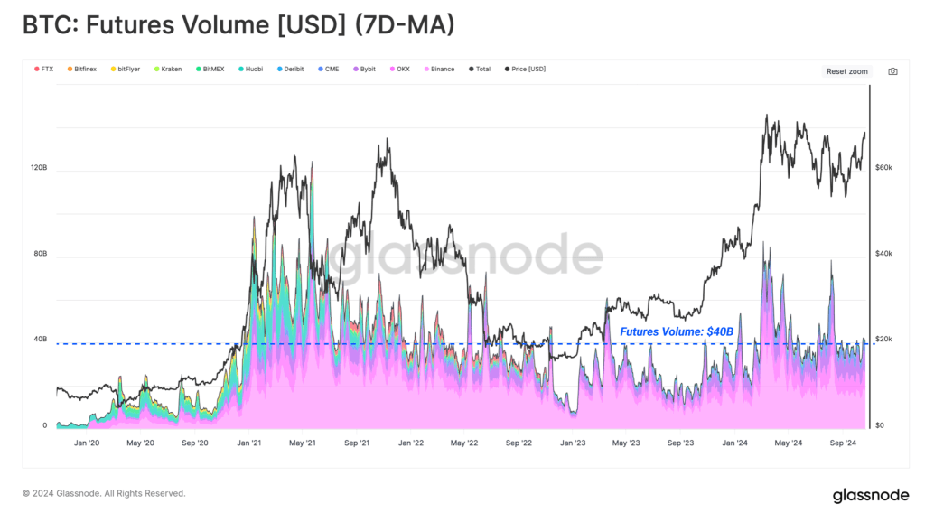 Média móvel de 7 dias do volume de futuros de Bitcoin. Fonte: Glassnode